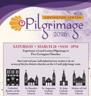 Experience a personal LENTEN PILGRIMAGE of five churches in Covington on SATURDAY, MARCH 28, 2026. Churches will be open from 9AM to 2PM, rain or shine! Join in at any time and start at any of the churches – The Cathedral Basilica of the Assumption, St. Benedict, St. Augustine, St. John the Evangelist, or Mother of God – the route will be clearly marked from each of them. Walk (or drive) any or all of the 4.3-mile pilgrimage. Confession and Adoration will be available. For questions email: [email protected]