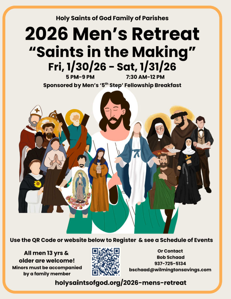 You are saints in the making! The Holy Saints of God family of parishes invites all men to a retreat sponsored by the Men’s ‘Fifth Step’ Fellowship Breakfast.