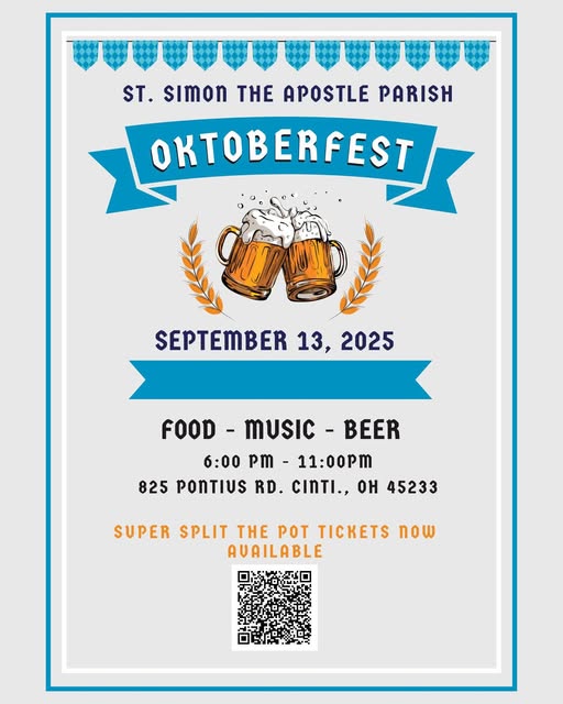 On September 13, St. Simon the Apostle Parish is having an adult-only Oktoberfest celebration (18+) with a $5 cover charge. All proceeds will help support St. Simon’s. We will have live acoustic music with Vicki Monahan from 6-7:30pm, followed by the always entertaining Howl’n Maxx!!! Holy Smokes BBQ will be selling pulled pork and smoked turkey sandwiches along with crowd favorites, the Cheesus Burger and the Dirty German. (Regular grill items will also be available.) Multiple Oktoberfest flavored beverages will be sold along with regular Westside favorites. Want to be a winner? Super split the pot, hourly split the pots, bars n bells, and a bourbon raffle with a handmade wooden cooler will all be raffled off that night.