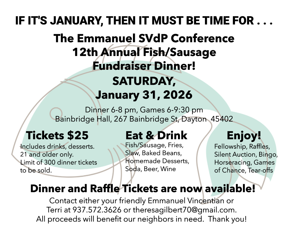 Tickets: $25 (only 300 will be sold!) — includes drinks and desserts. Purchase from your friendly Emmanuel Vinentian, call Terri at 937.572.3626 or email [email protected].